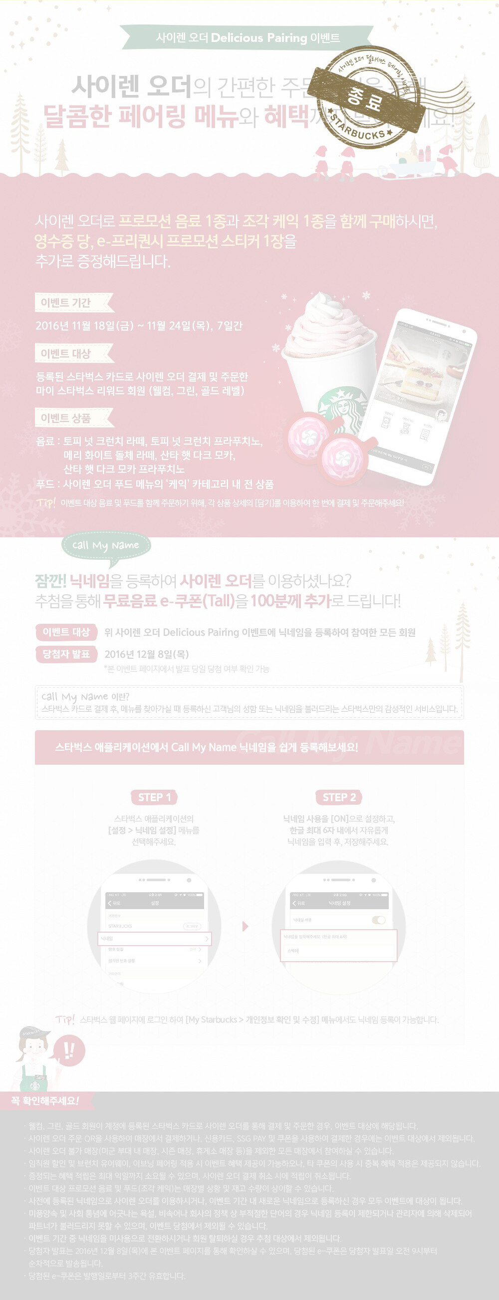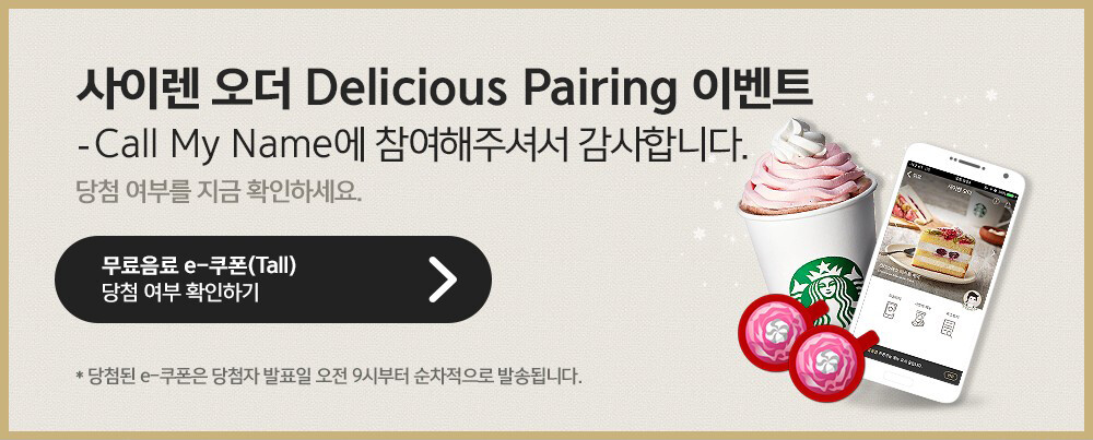 당첨 여부 확인 하기 닫기 아이디를 조회 하세요 아이디를 입력하세요 * 아이디를 정확히 입력해주세요. 당첨자는 꼭 확인해주세요! 당첨된 e-쿠폰은 12월 8일(목) 오전 9시부터 순차적으로 발송됩니다. 당첨된 e-쿠폰은 발행일로부터 3주간 유효합니다. 회원님의 스타벅스 카드를 제시하시어 e-쿠폰을 사용해주시기 바랍니다. 당첨 후 탈퇴하거나, 비정상적인 방법으로 응모 시 당첨이 취소될 수 있습니다. 잘못된 정보로 인한 불이익에 대해서 스타벅스는 책임지지 않습니다. 무료음료 e-쿠폰 사용 시 유의 사항 스타벅스 매장에서 파트너가 제조한 음료(Tall Size) 한잔이 무료로 제공됩니다. 병음료, 생수, 요거트,바나나 프라푸치노, POC 브루드 커피, 리저브 음료, 과일 음료 4종, 파미에파크 전용음료 등 일부 음료는 제외됩니다. 스타벅스 전 매장에서 이용 가능하며, 유효기간이 자나면 사용여부와 관계없이 소멸됩니다. (미군부대, 일부 입점 매장 쿠폰 사용 불가) 타 쿠폰 및 세트 메뉴와 중복 사용 불가합니다. 현금 및 다른 상품으로 대체 수령 불가합니다.